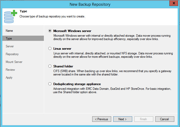 Once you get the Wizard going, you’ll want to give the repositories meaningful names. In my case I will call them SoBR-01, SoBR-02, and SoBR-03 as those are the server names. On the next screen, choose the appropriate type of repository. In my case these are all Windows servers, but this will vary from environment to environment. A bit of a side note: CIFS is usually recommended as a solution to avoid as there are a lot of issues that stem from SMB clients.
