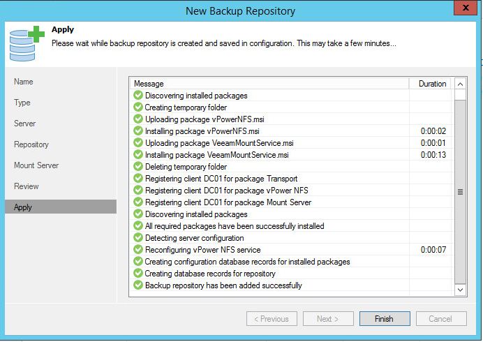 On the next screen lets leave the vPower NFS service enabled (default) - you likely want to leave this enabled for performance. Hit Next. At the Review screen we have the option to import existing backups - since this is a new repository I won’t have any backups there, so I’ll leave it unchecked and wrap up the Wizard. Hopefully you’ll end up with a bunch of green check marks.