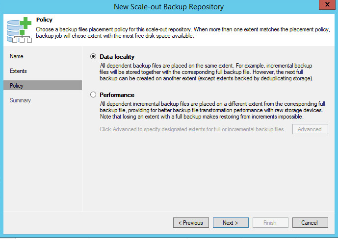 Next up we need to make an important decision which determines how the scale-out backup repository is used. It can either be used to keep all related files together or to spread them apart for performance. When they are spread apart the incremental backup files are placed on different repositories - this can be dangerous in that if you lose a repository you will break your incremental backup chain. This is something that will need to be assessed in every environment.