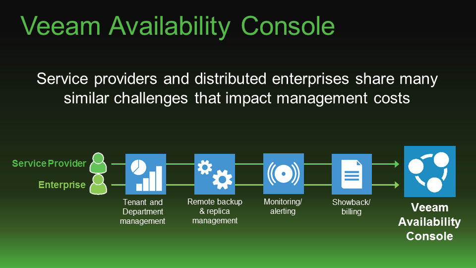 So, how is Veeam planning on letting administrators handle these new Endpoints? Well with the Availability Console of course. The Console is aimed at both Service Providers and Enterprises alike. The goal is to provide a ‘single pane of glass’ for all things Veeam related: backup & replication management, monitoring, billing, and agent management.