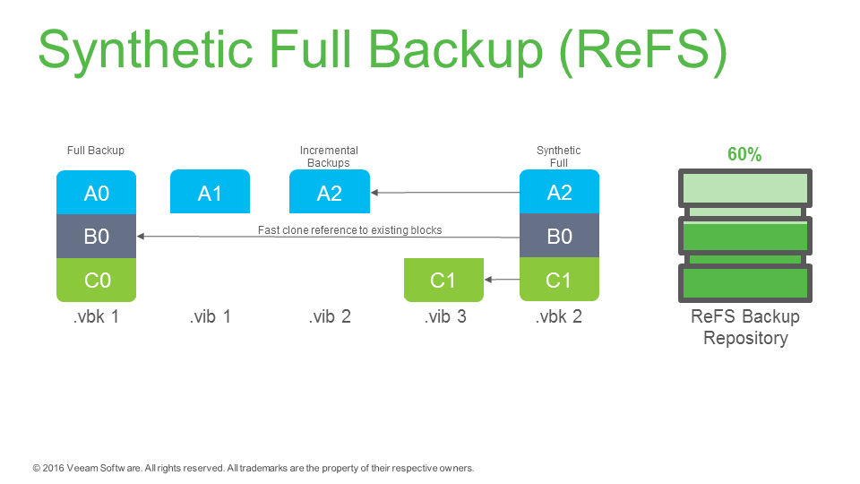 Of note is that deduplication is not currently available under ReFS. You should still see space savings as not as much data needs to be written now. An Active Full won’t have much of a performance change as this method requires each block to be read from production, and not the backup repository.