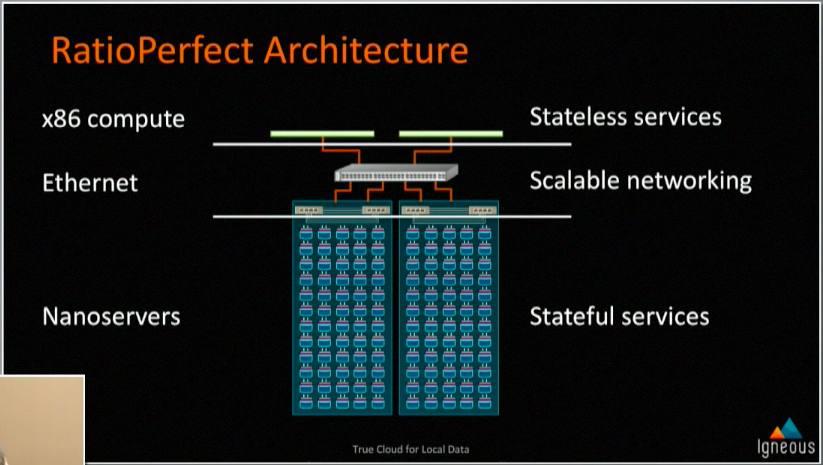 Igneous started looking at solutions. It started off with realizing that losing a whole server or disk shelf was not acceptable. Next, they looked at doing them in groups of four, however, if they were putting 16 drives in a 1U server, the risk of losing %25 of their storage and performance was still too high. They focused on the problem and noticed that they were quickly moving to a 1 CPU : 1 Drive ratio, but to do that with traditional compute just isn’t feasible from a cost perspective.