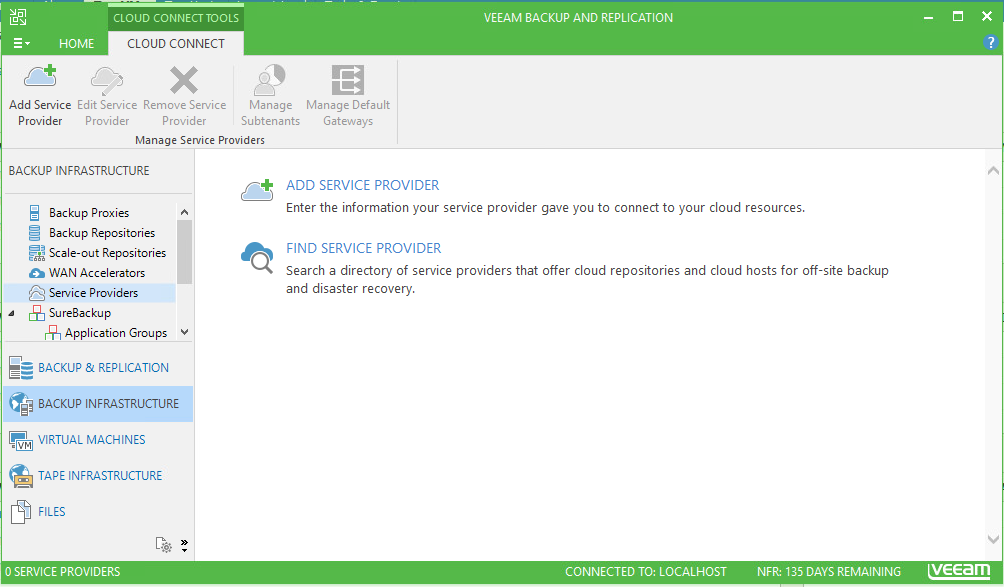To start things off, open up your Veeam Backup & Recovery console and head to Backup Infrastructure –> Service Providers and click on the Add Service Provider. If you haven’t yet found a service provider, you can actually use the ‘Find Service Provider’ option to find a Veeam Partner to help you out.