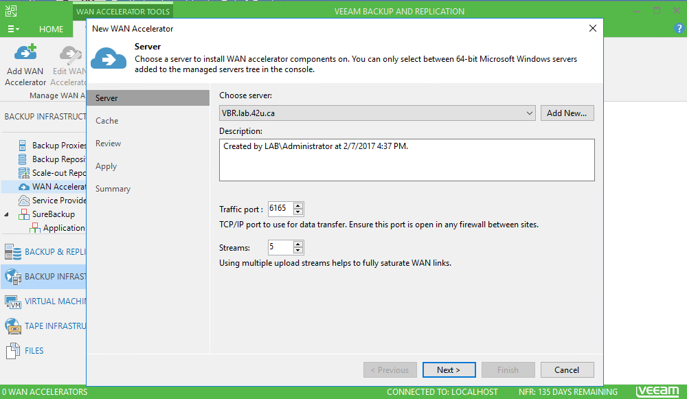 In my case, I am installing the WAN Accelerator right on my VBR server. Depending on your environment, you may need to move it elsewhere. Some considerations for its placement include available space on the server, CPU workload, as well as potential bandwidth restrictions. The typical recommendation is 4 CPU and 8 GB of RAM. Given that this was setup in my home lab, the server has 2 CPU and 8 GB of RAM and performed fine. I would re-evaluate for production use though. Also note that we’ll need to open up outbound TCP 6165. Lastly, you can adjust the number of streams being sent. The number of streams may be something that you need to play around with to figure out the optimal value. The WAN Acceleration page from the Veeam Best Practices guide has some excellent info on the subject.