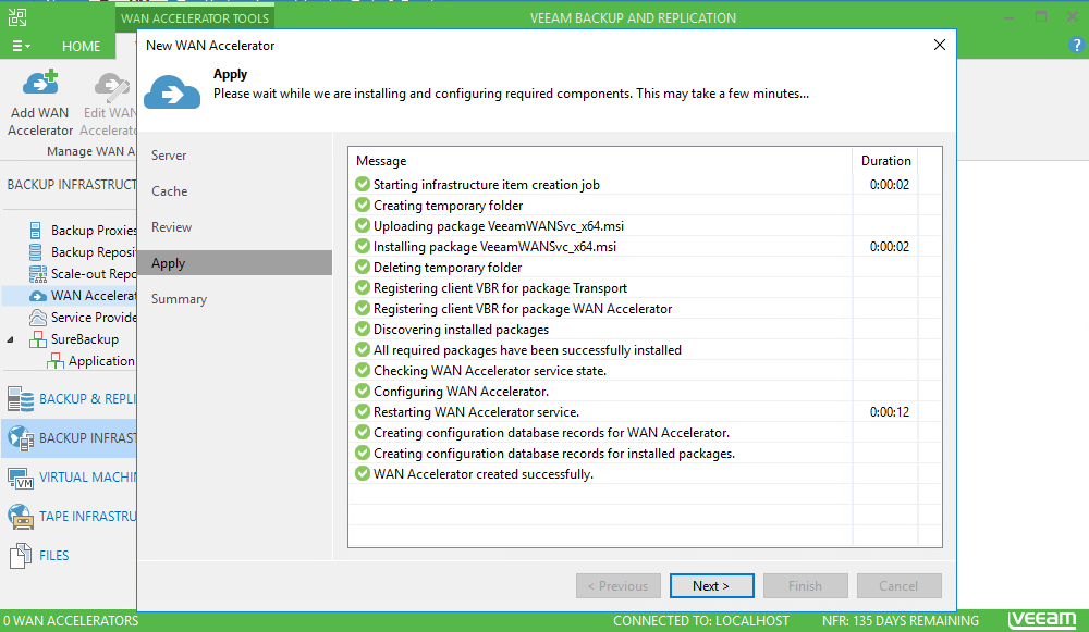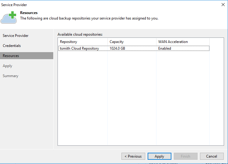 Assuming you have the correct information, hitting the Apply button will take you to the next screen. This is a good chance to review the settings and make sure they line up with what your agreement states. Also, note that this particular repository does support WAN Acceleration. I’ll cover off installing the WAN accelerator further down..