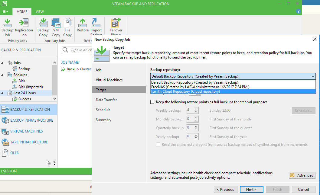 As part of the setup, I pointed out that Tim had setup a WAN accelerator. The built-in WAN accelerator was first introduced in Veeam B&R version 7, and is available starting at the Enterprise level license. If all you need it for is for use with Cloud Connect, then the Enterprise edition will fit the bill. However, if you want to use it for a Backup Copy Job to a non-Cloud Connect repository, you’ll need to look at Enterprise Plus.