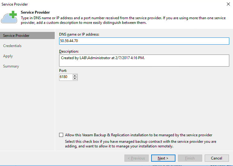 Back in the Service Provider wizard, you’ll need to enter either the IP Address or DNS host name for your providers Cloud Connect Gateway. If your provider will be managing your Veeam installation, you’ll need to check off the checkbox at the bottom of this window. In my case, I did not need this option. You may also note that TCP & UDP port 6180 needs to be opened for outbound access from your Veeam server.