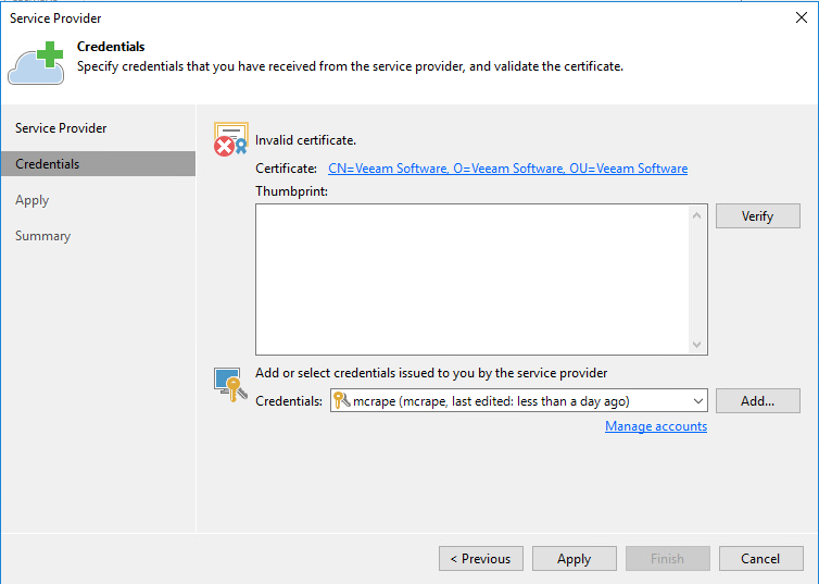The next step will pull down the SSL certificate that will be used for your connection. Be sure that the certificate you receive is valid! Although Veeam will use a Cloud Connect repository that has a self-signed certificate, I would argue that if a partner can’t shell out a few bucks for an SSL certificate and configure it properly, then you probably don’t want to use them. For the purposes of this post, Tim set up a test environment, and thus used a self-signed certificate … I trust Tim! Luca Dell’Oca has also just published a great post on using Let’s Encrypt with Veeam Cloud Connect.