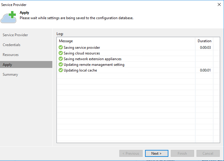 After we confirmed the details, hit Apply once more. This will start the process of going through the tasks and configuring the Cloud Connect repository for local use. Hopefully, you’ll see a bunch of Veeam Green check marks. After that hit Next, followed by Finish on the Summary screen.