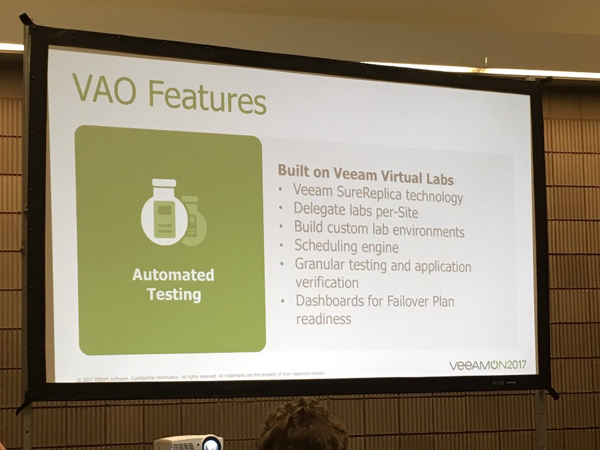 With the foundation set, we jumped right into VAO. So, what exactly does VAO do? To start, it is VMware-only at the moment and its goal is to handle all of the ‘stuff’ that goes with performing a DR / BC plan and automate as much as you can. For example, it can build out your documentation for you and hand-off a Word file that you can do with what you please. This is also useful for finding changes over time, whether or not they were planned or not. VAO will also handle automated tests - think about building out plans based on SureBackup where you can be sure that your DR will work as you planned.
