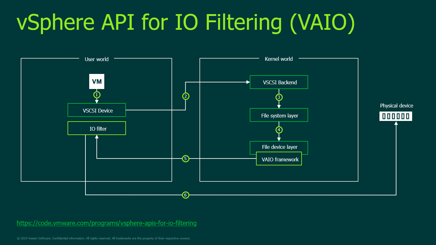 CDP leverages VMware’s vSphere APIs for I/O Filtering (VAIO), which was first released in vSphere 6.0 Update 1. This API effectively gives 3rd party vendors (i.e. Veeam) the ability to get Guest OS data without a) impacting performance or b) needing to install any sort of guest agent. The way it works is the filter lives within the ESXi host, which allows it to intercept data from the Guest OS as it is being written to the VMDK. Data which is passed through this filter can then be used either for caching (thus providing better performance), or for replication. Needless to say, Veeam is using it for the latter. What is worth noting is the filter sits in user space, which means if something were to go wrong, it will not crash the ESXi host.
