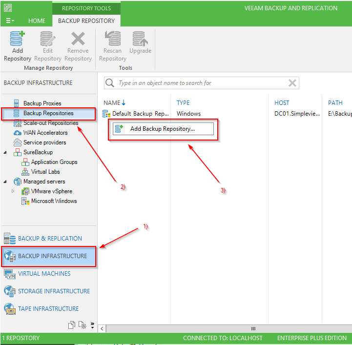 To get the ball rolling, the first thing we need to do is add these servers as regular Backup Repositories. This can be done by going to the Backup Infrastructure tab, select Backup Repositories, and then right-click on the right-side pane and choose Add Backup Repository.