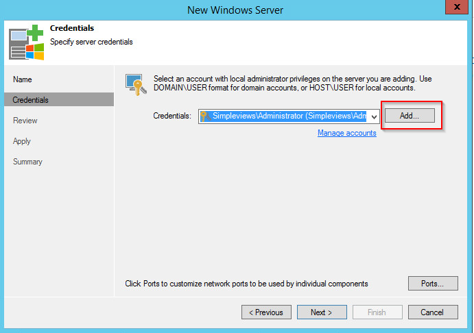 Next up is the Server portion of the wizard. This is where we will need to add the servers into Veeam. Hit the ‘Add New’ button which will start up a new wizard. Enter the requested details in this wizard such as hostname and the credentials required to login to install the agent software. If you need to add credentials in order to log onto the server, click the Add button on the credentials page.