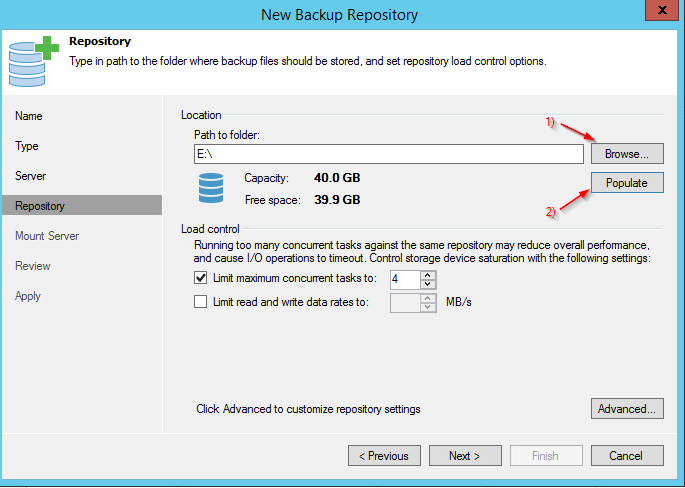 Hitting Finish brings you back to the New Backup Repository wizard. I took the opportunity now to just add the other two test servers I had, but this can be done after the fact as well. Select the server that we want to add as a repository and hit Next. We’ll now get an opportunity to assign the storage volume from that server - click the Browse button and find the volume that you want to add, and then hit the Populate button. If everything looks good, hit Next.