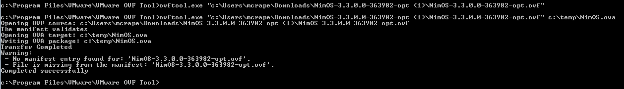 Now that we have the files extracted, we need to bundle them back up into an OVA file. Open up the command prompt and navigate to the OVF Tool install folder. In my case, I had to go to c:\Program Files\VMware\VMware OVF Tool. To repackage the files, run the following command: ovftool.exe Source.ovf Output.OVA. See the image for an example of the command that I ran. Depending on the size and number of files involved, this might take a few seconds up to a few minutes. Once it is done, you should find a new OVA file sitting where you specified (c:\temp\ in my case).