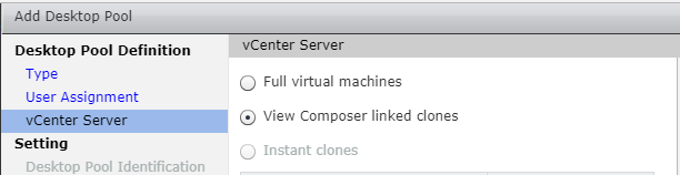 When defining a desktop pool, you’ll be able to choose from one of the following three options below. Each type of pool has limitations as to what type of VMs or machines it can use: