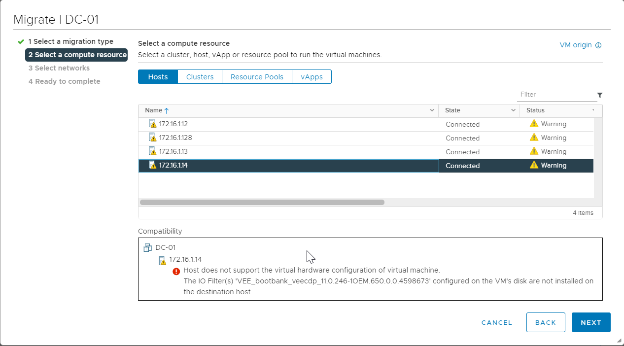 So I spin up a new vCenter, attach the hosts, make sure the shared iSCSI datastore is available across all the hosts, setup networking, and start vMotioning VMs off my NUCs. All is fine and dandy, until I hit a VM that I was using Veeam CDP with. When attempting to vMotion, I would receive the error pictured below (I/O filters are not installed on the destination host).